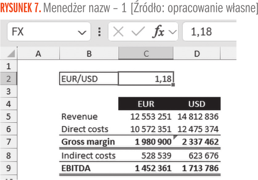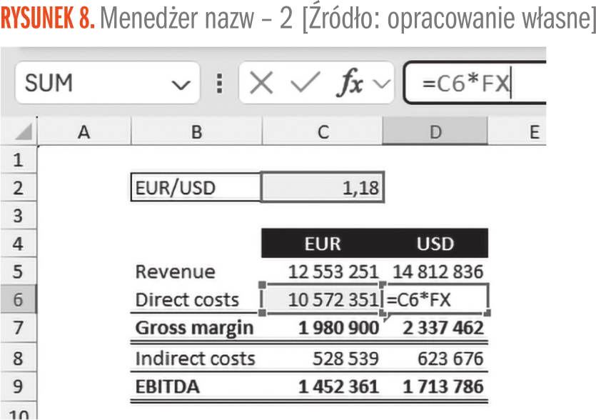 Ostatni trik Excelowy, o którym chciałbym wspomnieć, to menedżer nazw. W Excelu można sobie ułatwić życie na wiele sposobów. Jednym z nich jest właśnie menedżer nazw. Jak go mądrze wykorzystać? Na przykład tak jak na rys. 7 i 8. Załóżmy, że chcemy użyć menedżera dla naszego kursu EUR/USD. W tym celu wpisujemy kurs w komórce C2, a następnie w lewym górnym rogu wprowadzamy wartość tekstową FX. Każda komórka ma swoją nazwę, a my jedynie zamieniamy C2 na FX, co spowoduje, że za każdym razem, gdy w formule (jak na rys 8) wprowadzimy wartość FX, to Excel automatycznie zrozumie, że chodzi nam o wartość z komórki C2. Dlaczego to doskonałe narzędzie? Przede wszystkim dlatego, że uwalnia nas od konieczności blokowania komórek lub zakresu. Jest to zwłaszcza istotne, gdy w wielu miejscach w pliku odnosimy się do tej jednej wartości, a jak wiemy, jeśli musimy wykazać rachunek zysków i strat w dwóch walutach, to zdecydowanie lepiej użyć menedżera nazw niż w każdej formule referować do zablokowanej komórki C2.