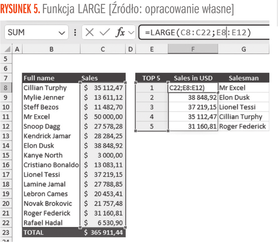 Z tego względu obok zestawu danych zbudujemy bardzo prosty raport. W pierwszej kolumnie wprowadźmy listę od 1–5 (znamy już na to min. 3 sposoby zaprezentowane powyżej). W drugiej kolumnie wykorzystamy funkcję LARGE, która jest niezwykle prosta w użyciu. Zgodnie z rys. 5 wystarczy w pierwszym argumencie zaznaczyć zakres danych, który byśmy normalnie sortowali (a w tym przypadku chcemy tylko 5 największych liczb). Drugi argument to zakres ze stworzoną przez nas listą od 1–5. Klikamy Enter i nasz mini raport jest już prawie gotowy. Czego brakuje? Oczywiście przypisania sprzedawcy. Bez tego raport jest niepełny. Co robimy? Używamy dobrze znanej już funkcji XLOOKUP, wybierając w pierwszym argumencie kwotę z kolumny F. Naszym lookup array jest oczywiście kolumna C, a return array kolumna B. Tak oto otrzymujemy automatyczny raport ukazujący TOP 5 sprzedawców (Rysunek 5).