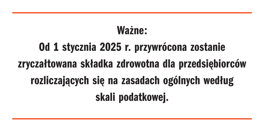 Od 1 stycznia 2025 r. zmienią się zasady obliczania składki na ubezpieczenie zdrowotne przez przedsiębiorców. Przedsiębiorcy rozliczający się według skali podatkowej powrócą do stałej składki zdrowotnej wynoszącej 9% od 75% minimalnego wynagrodzenia. W warunkach 2024 r. byłoby to 286,33 zł miesięcznie, a w 2025 r. będzie to ok. 310 zł. Przedsiębiorcy rozliczający się ryczałtem od przychodów ewidencjonowanych także zapłacą 310 zł, jeżeli ich przychody nie przekroczą 4-krotności przeciętnego wynagrodzenia.