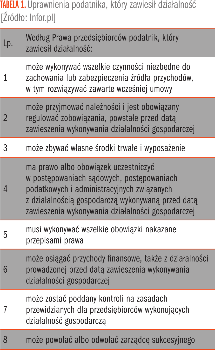 W okresie zawieszenia działalności gospodarczej przedsiębiorca nie może prowadzić aktywnej działalności ani osiągać bieżących przychodów. Od tej zasady Prawo przedsiębiorców przewidziało wyjątki (Tabela 1).