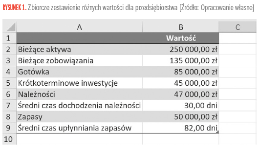 Aby móc wyliczać odpowiednie wskaźniki, potrzebny nam będzie arkusz Excela, w którym będziemy mieć zsumowane różne wartości dla przedsiębiorstwa. Przykład takiego arkusza pokazany jest na rysunku 1.