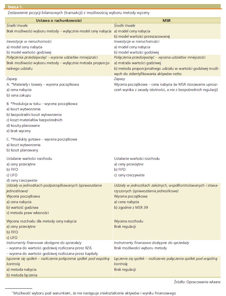 W Polsce stosuje się jeden z dwóch sposobów sporządzania sprawozdawczości finansowej: zgodnie z ustawą o rachunkowości (dalej „ustawa”) lub też zgodnie z Międzynarodowymi Standardami Rachunkowości w zakresie przyjętym przez Unię Europejską („MSR”), przy czym zakres podmiotów, które mogą stosować MSR, jest mocno ograniczony (spółki publiczne, podmioty zależne od podmiotów sporządzających sprawozdania finansowe zgodnie z MSR). Zarówno w ustawie, jak i w MSR można znaleźć regulacje, zgodnie z którymi określony składnik aktywów czy też pasywów może podlegać pomiarowi w różny sposób (sytuacja ta dotyczy także sposobu rozliczenia pewnych transakcji gospodarczych), a sposób pomiaru (rozliczenia) zależy od arbitralnej decyzji podmiotu. W Tabeli 1. zostały przedstawione najważniejsze pozycje aktywów i pasywów (rozliczenia transakcji gospodarczych), dla których istnieje możliwość wyboru między różnymi metodami wyceny.