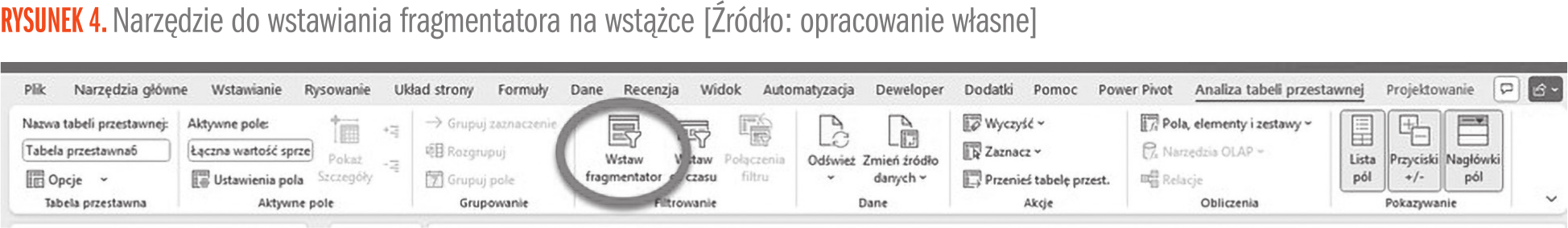 Aby teraz dołożyć fragmentator (ang. slicer) do naszej tabeli przestawnej, wystarczy wejść na wstążce na kartę „Analiza tabeli przestawnej” i wybrać narzędzie „Wstaw fragmentator” pokazane na Rysunku 4.