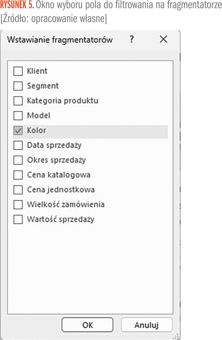 Po wybraniu tego narzędzia pojawi nam się okno, w którym musimy zdecydować, według którego pola (lub według których pól) będziemy filtrować tabelę przestawną. W naszym przypadku będzie to pole „Kolor”, a okienko wyboru jest pokazane na Rysunku 5.