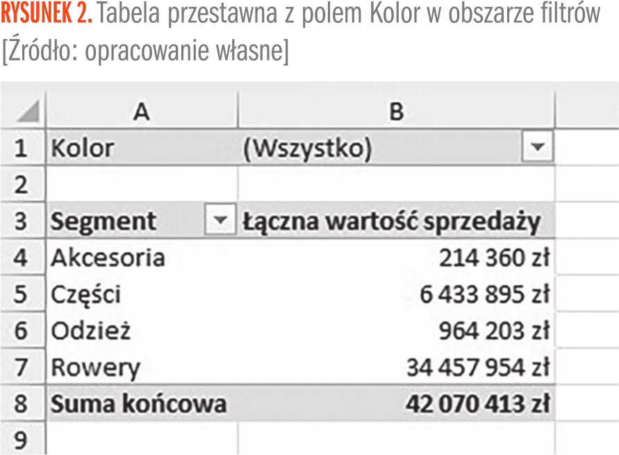 Załóżmy, że mamy tabelę przestawną pokazującą łączną wartość sprzedaży w każdym segmencie towaru (tabela taka została pokazana na Rysunku 3) i chcemy ją przefiltrować po kolorze towaru.