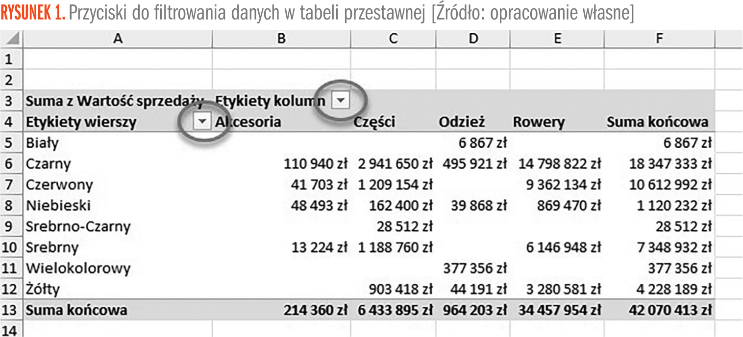 Jeśli pracujemy w Excelu z tabelami przestawnymi, może się zdarzyć, że będziemy potrzebować w pewien sposób przefiltrować dane, które są pokazywane w tabeli przestawnej. Takie filtrowanie można wykonać na kilka sposobów. Pierwszym, tradycyjnym sposobem jest wykorzystanie przycisków do filtrowania w tabeli przestawnej, które są dostępne w momencie, gdy dodamy jakieś pole do obszaru wierszy i/lub kolumn w tej tabeli. Przyciski te dla przykładowej tabeli przestawnej pokazującej wartość sprzedaży towarów w poszczególnych kolorach dla poszczególnych segmentów przedstawiono na Rysunku 1.