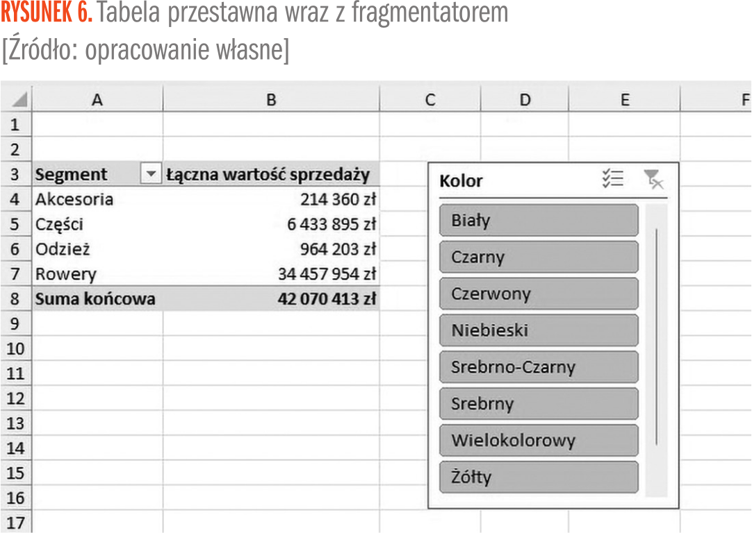 Kliknięcie na dowolny przycisk na fragmentatorze spowoduje przefiltrowanie naszej tabeli przestawnej. Jeśli chcemy odfiltrować dane dla dwóch lub więcej kolorów, to można klikać przyciski na fragmentatorze z wciśniętym klawiszem Ctrl na klawiaturze lub w prawym górnym rogu okna fragmentatora zaznaczyć opcję „Wybór wielokrotny” (jest to ikona z listą wypunktowaną). Wtedy po jej zaznaczeniu będzie można klikać i odklikiwać przyciski (pierwsze kliknięcie zaznaczy daną wartość, natomiast drugie kliknięcie ją odznaczy).