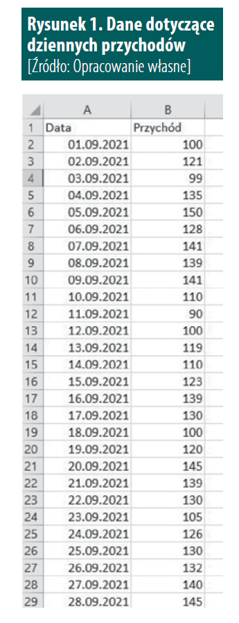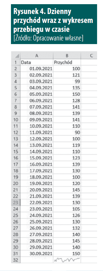 Wykresy przebiegu w czasie to bardzo specyficzne wykresy, które są umieszczane wewnątrz jednej komórki. Służą przede wszystkim do pokazania trendu w danych, sezonowości lub różnego rodzaju odchyleń. Załóżmy, że mamy dane dotyczące dziennego przychodu z jednego miesiąca. Dane takie pokazuje Rysunek 1.