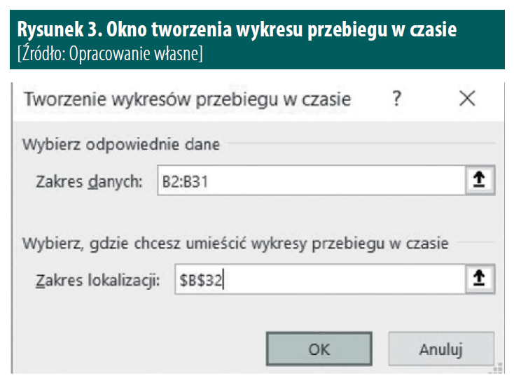 Bez względu na typ wykresu, który wybierzemy, pojawi się okno, w którym musimy zdefiniować zakres zawierający nasze dane oraz tzw. zakres lokalizacji, czyli komórkę, w której chcemy umieścić wykres przebiegu w czasie. Może to być dowolna komórka, bardzo często jednak wykresy przebiegu w czasie tworzy się w pierwszej pustej komórce pod danymi lub obok danych, w zależności od tego, jak te dane są umieszczone w arkuszu. Uzupełnione okno wstawiania wykresu przebiegu w czasie pokazuje Rysunek 3.