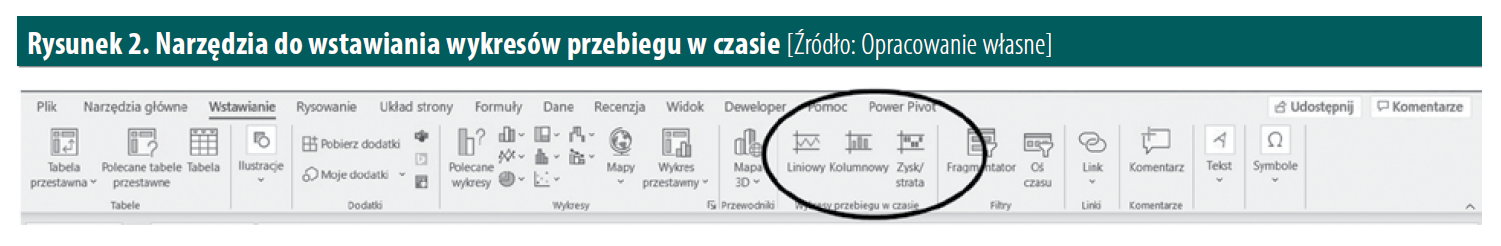 Na podstawie tych danych chcielibyśmy wstawić wykres przebiegu w czasie. Narzędzia do tego znajdziemy na wstążce na karcie Wstawianie w grupie Wykresy przebiegu w czasie. Są one pokazane na Rysunku 2.