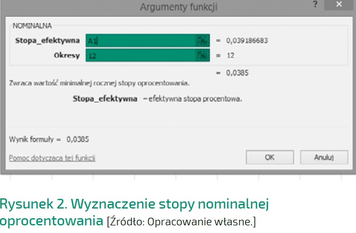 Znając stopę nominalną oraz częstotliwość kapitalizacji odsetek w pierwszej ofercie przy zastosowaniu tej funkcji można zatem z łatwością obliczyć efektywną stopę oprocentowania, która pozwoli na lepsze określenie opłacalności planowanych przedsięwzięć niż stopa nominalna. Załóżmy sytuację, w której planowane jest otwarcie lokaty bankowej na okres dwóch lat i należy dokonać wyboru między dwiema konkurencyjnymi ofertami rynkowymi. Zgodnie z ofertami oprocentowanie lokat wynosi 4,0% i 3,85%. Kapitalizacja odsetek w pierwszej ofercie następuje jednak w stosunku rocznym, podczas gdy druga z nich zakłada kapitalizację miesięczną. Stopa efektywna pierwszej lokaty jest wobec tego równa jej stopie nominalnej. W drugim przypadku natomiast należy posłużyć się prezentowaną formułą, co zostało przedstawione na Rysunku1.