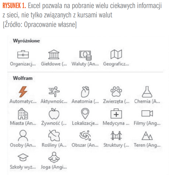 Nie jest to rzeczą powszechnie wiadomą, ale w Excelu można uzyskać informacje o bieżącym kursie walut. Wystarczy w komórce wpisać kodowe oznaczenie kursu, na przykład „EUR/PLN”. Następnie na karcie Dane, w grupie Typy danych, rozwijamy menu z poleceniami i wybieramy Waluty (rys. 1). Jeśli teraz klikniemy na komórkę z kodem wymiany, po prawej stronie pojawi się ikonka z tabelą, która po kliknięciu pokaże listę informacji, jakie możemy wstawić na prawo od naszej komórki. Co ciekawe, możemy wybierać kolejne pola i będą one wstawiane na prawo od poprzedniej informacji.