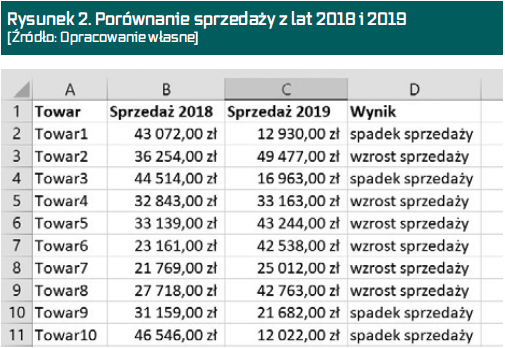 =WARUNKI(C2>B2;”wzrost sprzedaży”;C2=B2;”na tym samym poziomie”;PRAWDA;”spadek sprzedaży”)