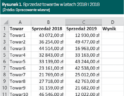W kolumnie Wynik chcielibyśmy mieć informację, czy sprzedaż w roku 2019 była wyższa, niższa, a może utrzymywała się na tym samym poziomie co w roku poprzednim. Standardowe podejście do tego problemu zakłada wykorzystanie zagnieżdżonej funkcji JEŻELI(). Spróbujmy jednak rozwiązać ten problem za pomocą funkcji WARUNKI(), która wprowadzona do komórki D2 powinna mieć następującą postać: