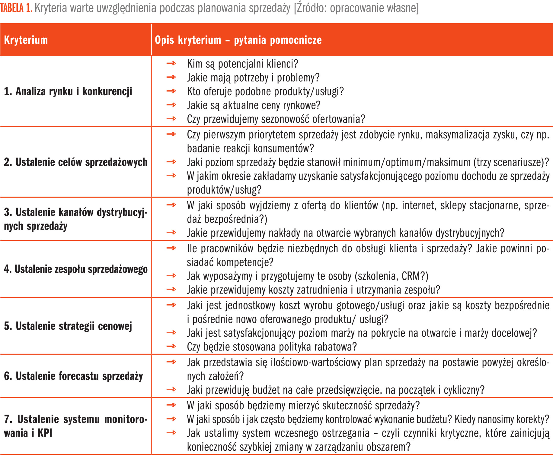 Regularne planowanie sprzedaży i późniejszy monitoring to jeden z najczęściej znanych i praktykowanych procesów, które funkcjonują w firmach. Oczywiste jest, że inaczej przebiega planowanie pierwszy raz, w nowopowstałej działalności, a inaczej już w funkcjonującym przedsiębiorstwie. Niemniej dla obu sytuacji podczas takiego planowania należy wziąć pod uwagę czynniki wskazane w Tabeli 1.