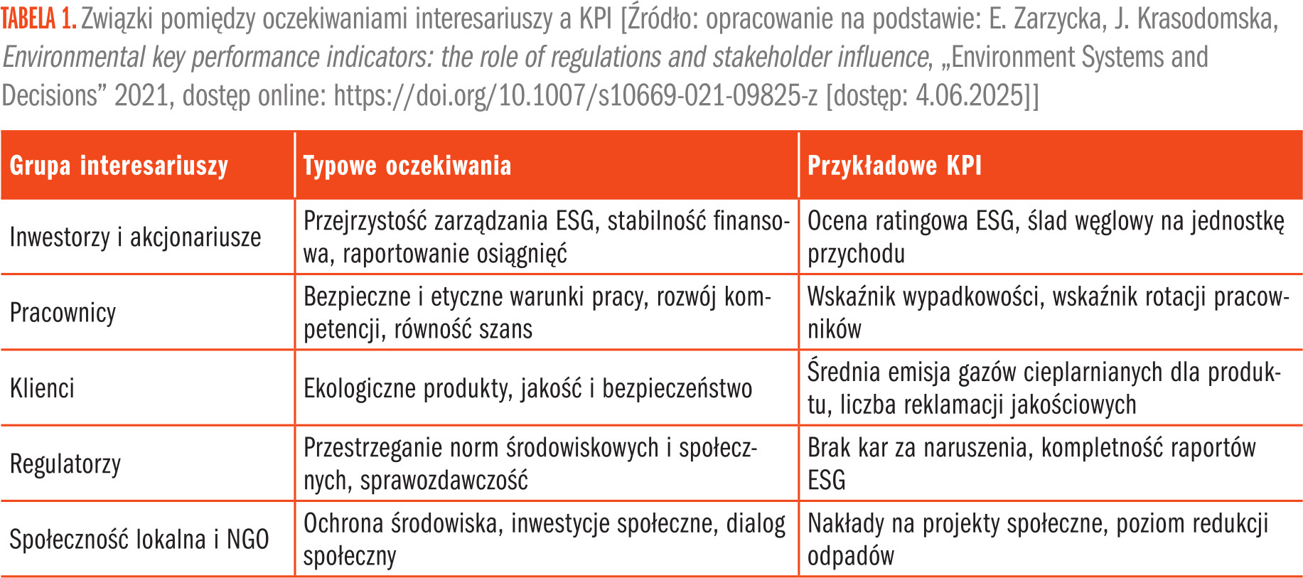 Tabela 1 przedstawia przykłady oczekiwań wybranych grup interesariuszy oraz wybrane KPI, które umożliwiają systematyczną analizę postępu realizacji celów ESG.