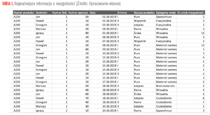 W tabeli 1 znajdują się najważniejsze informacje o niezgodności: numer produktu, kto zgłosił problem, na której linii produkcyjnej, na której operacji, jaka była zmiana i który dzień, jak nazywa się produkt, jaki jest to rodzaj wady oraz ile sztuk jest niezgodnych.